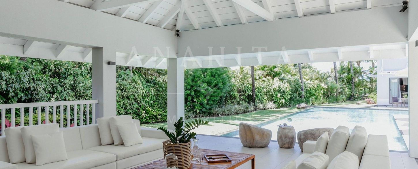 This exceptional 544 m² villa combines sleek, open spaces with tropical accents, such as wood and volcanic rock walls. Spread across two levels, this property occupies a generous 1,972 m² plot within the prestigious Lunea neighbourhood, offering convenient access to the golf clubhouse, dining options, swimming pool, and a shuttle boat service to the exclusive beach for Anahita residents on Île aux Cerfs.