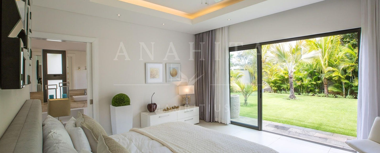 The master bedroom stands out with its 15 m² bathroom, featuring a central bathtub. The villa’s minimalist and contemporary white interior flows seamlessly onto a large terrace overlooking the swimming pool and a lush garden. A covered veranda and open patio provide additional outdoor living spaces.